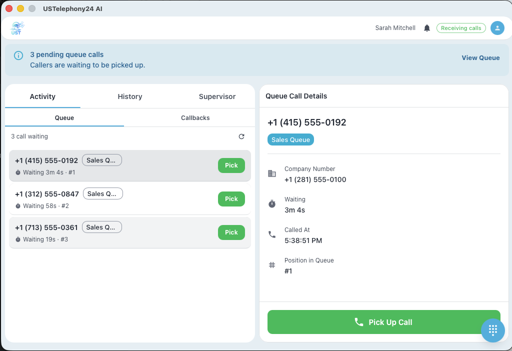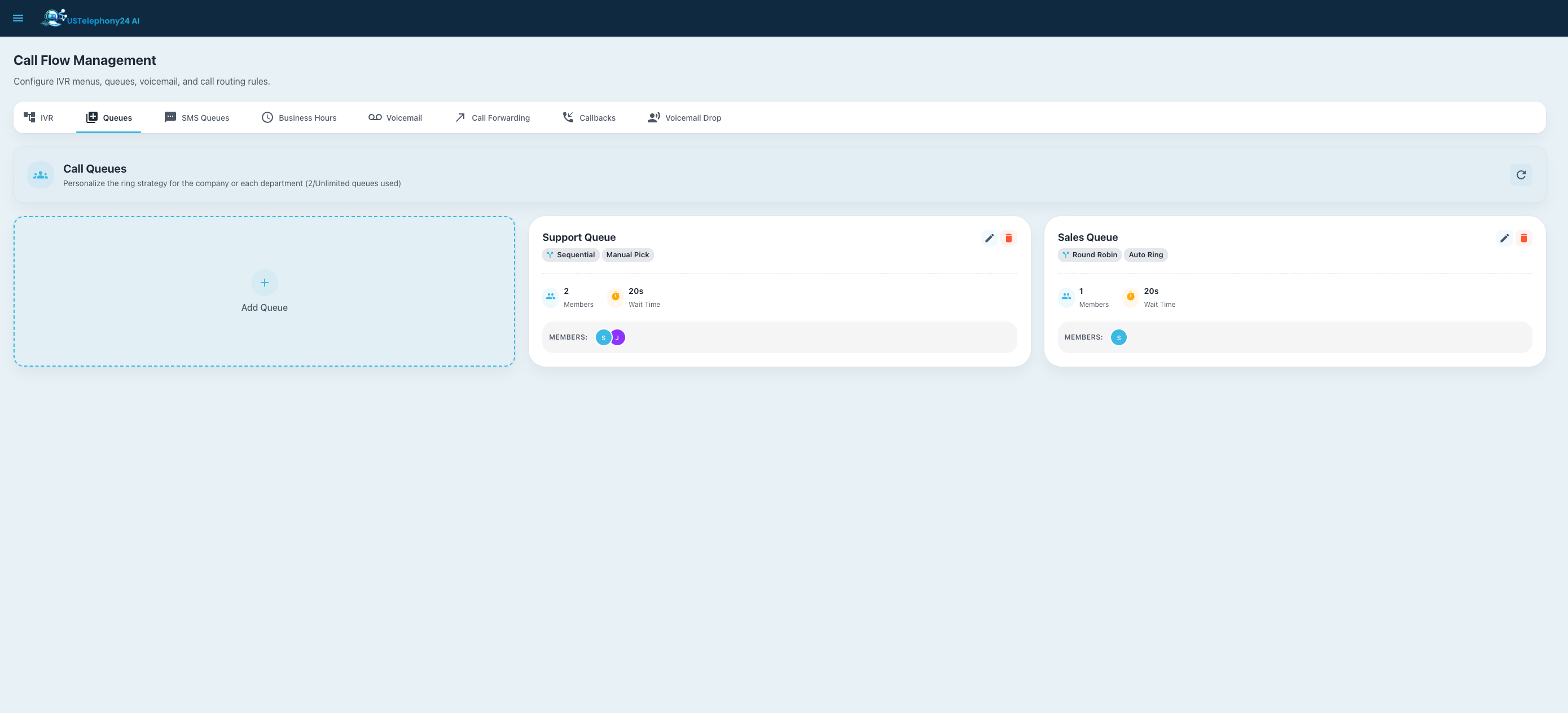 • Call Queues — Intelligent call distribution with round-robin, longest-idle, and ring-all strategies