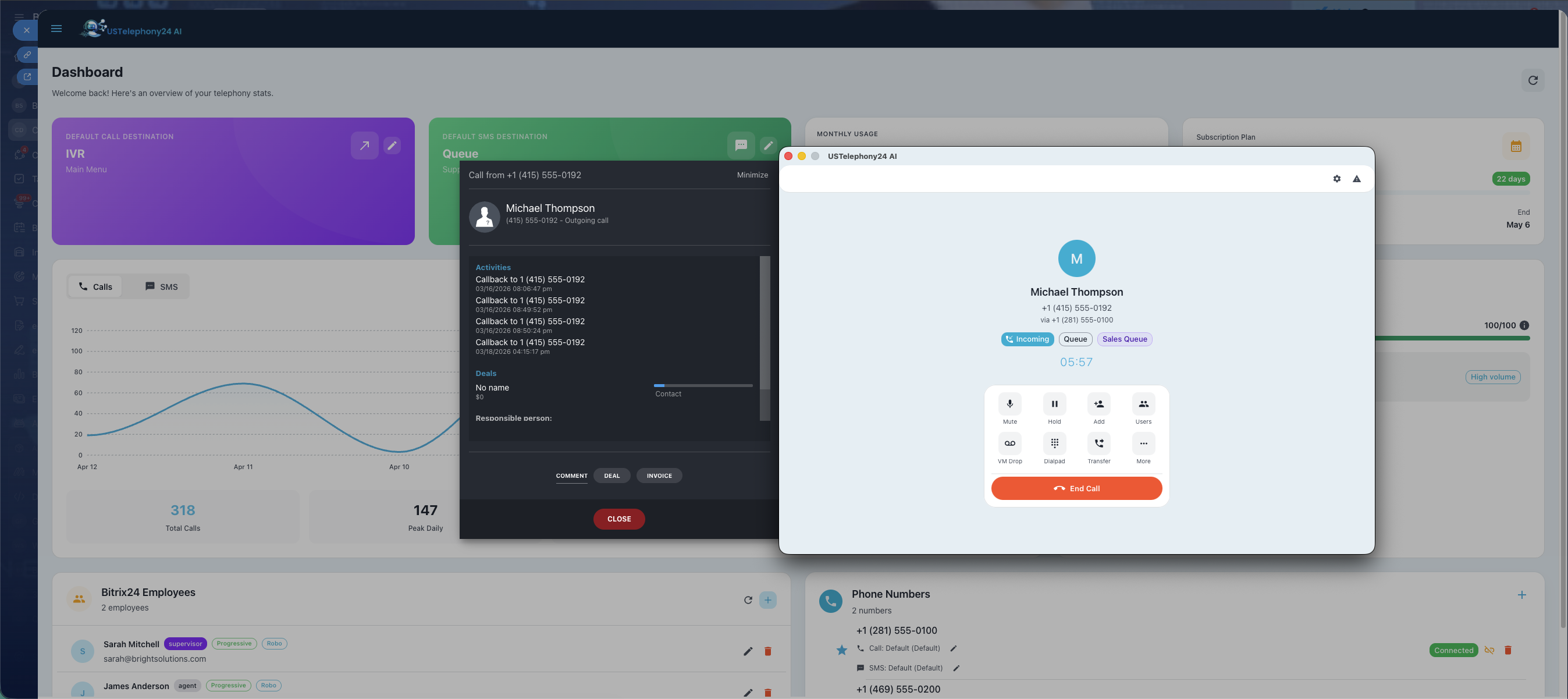 • Dashboard Analytics — At-a-glance call volume, SMS activity, and employee performance metrics