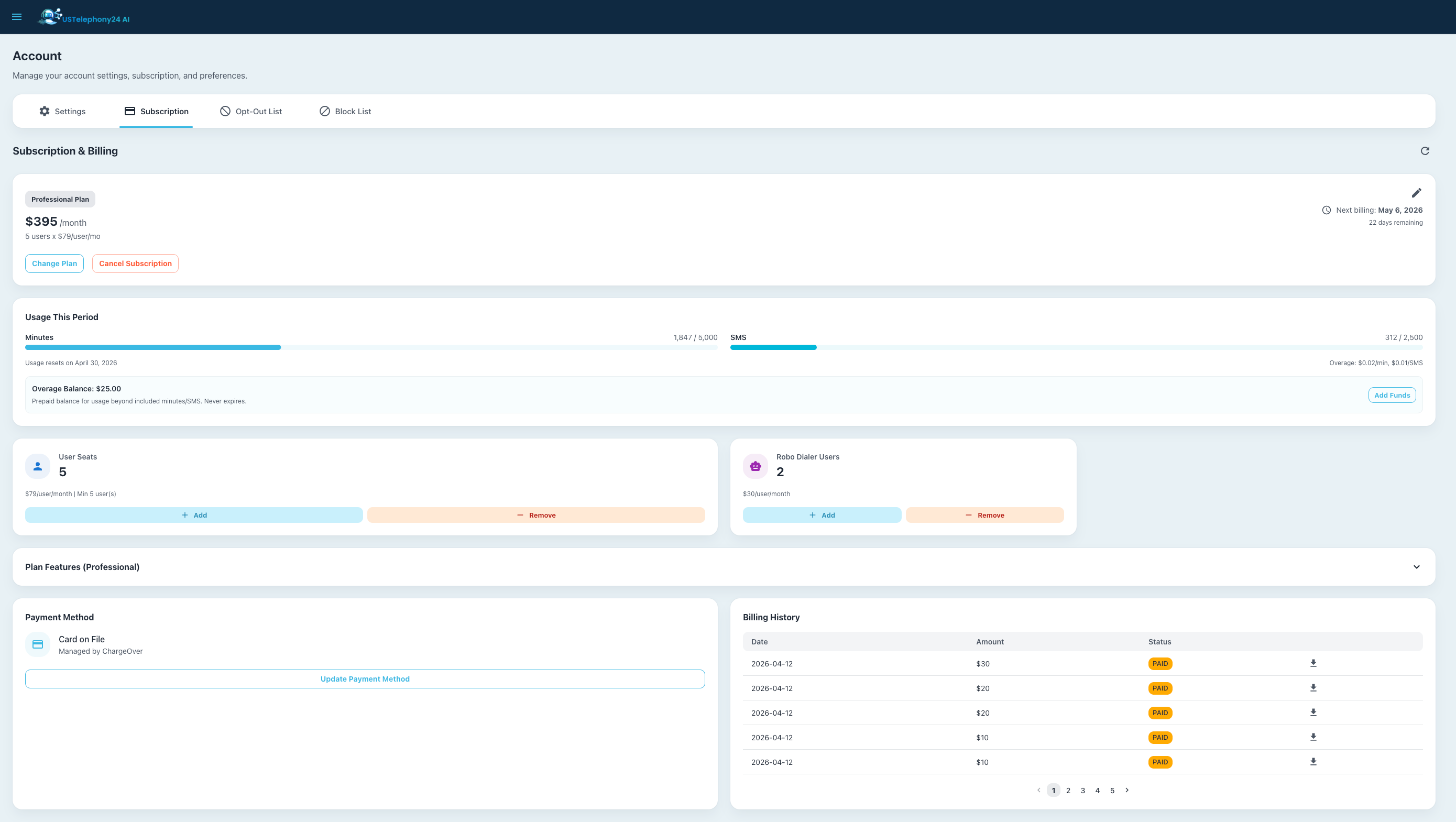 • Subscription Management — Multiple plans from 2 to 100+ users