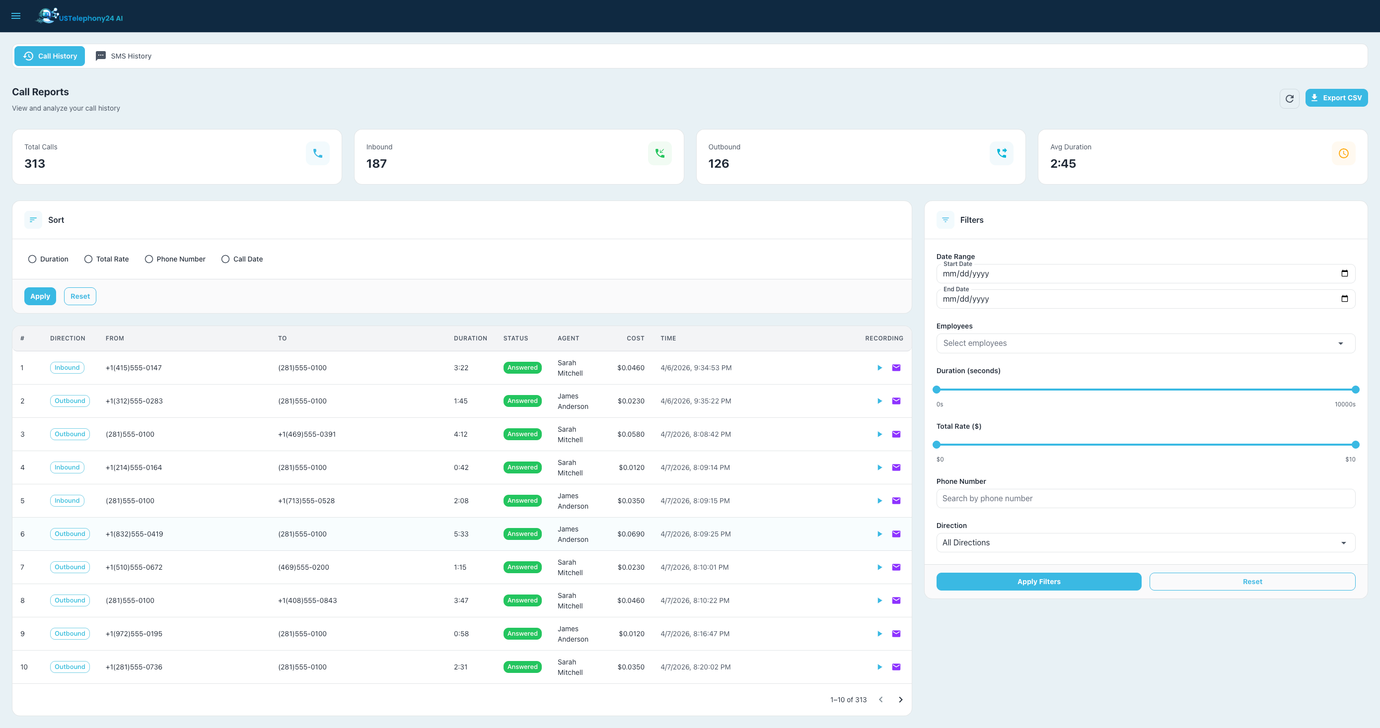 • Call Reports — Detailed call history with filtering by date, employee, status, and direction — exportable to CSV
