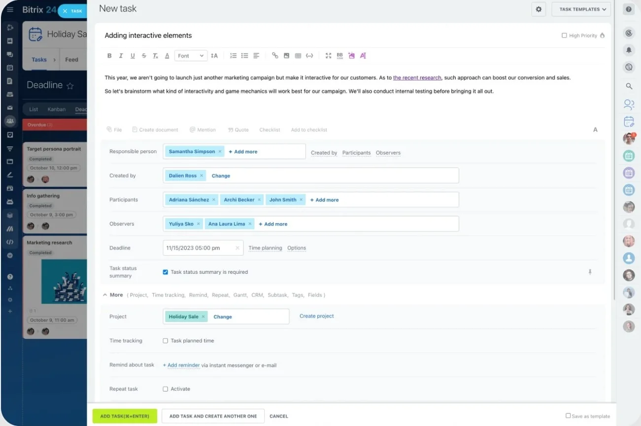 If you want a single place to anchor that system, Bitrix24 can centralize tasks, updates, and decisions so execution stays steady (even when schedules don’t).
