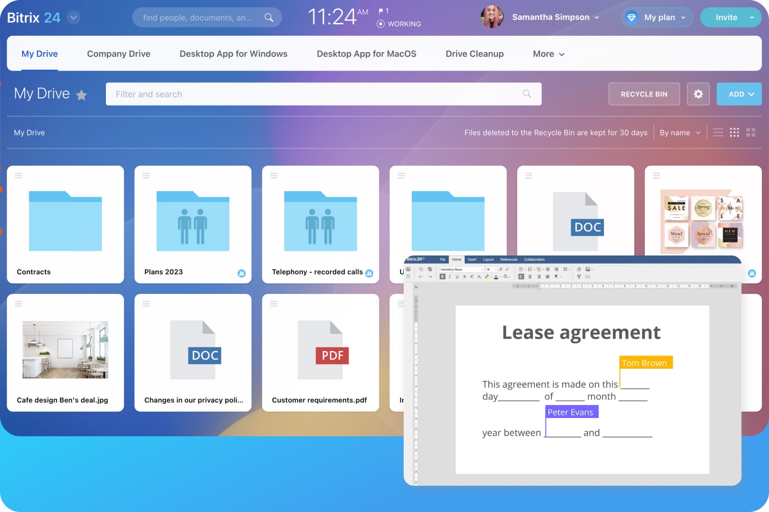 Schedule events and organize meetings in our calendar, create and co-edit documents online, manage and share your files in a secure cloud storage – all inside Bitrix24.