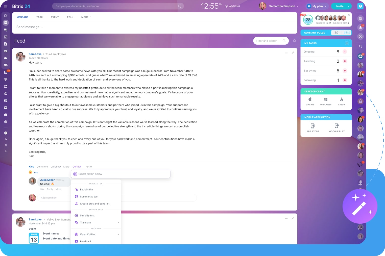 Bitrix24 features everything you need for productive team collaboration and communication: chat, online meetings, tasks, calendar, file storage, online documents, workflow automation, and more.