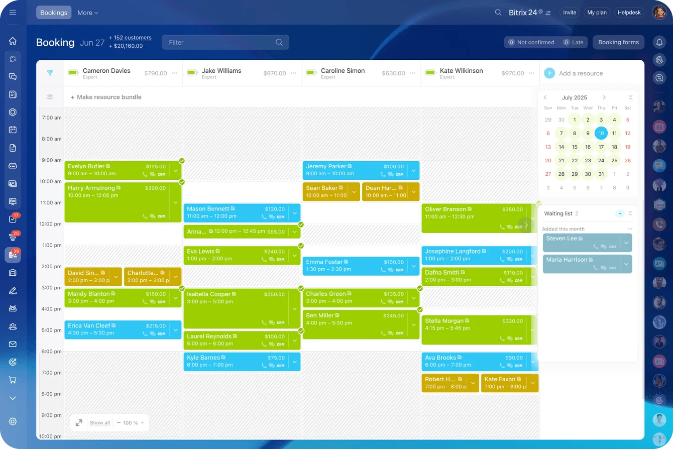 Make the most of your resources with Booking – an ideal tool for beauty salons, clinics, rental services, or any other business that relies on appointments. Integrated with our CRM, this tool allows you not only to keep your calendar full, but also retain clients.