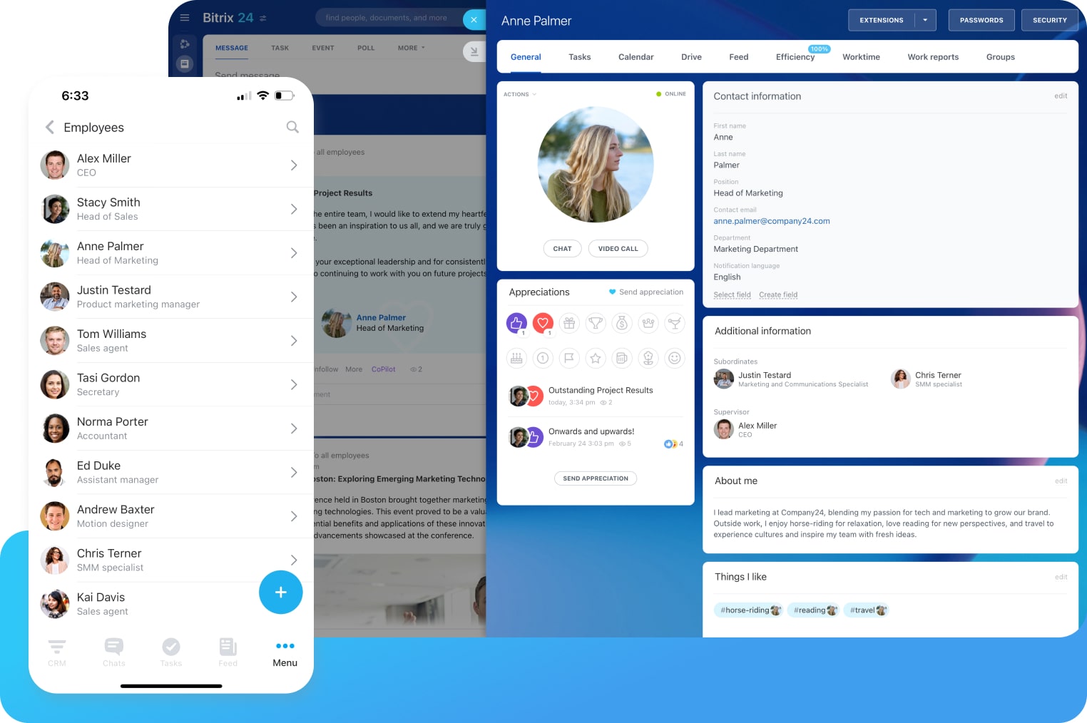 Manage your team on the go using our mobile app: all your chats, video calls, tasks, meetings, comments, employee profiles, and documents are here.